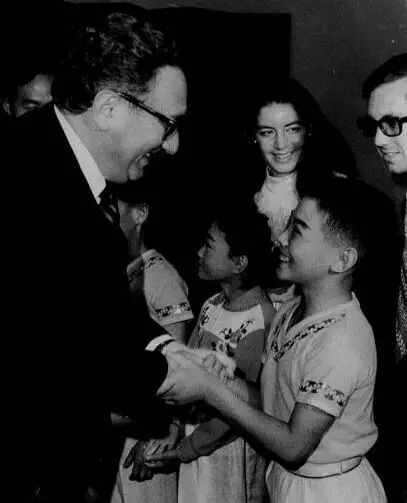图3中的两张照片的十分珍贵,是我在写《第三力量》这本书时,采访曾经亲历乒乓外交的委员会副会长时他给我的,左边是他们机构当时出版的有关乒乓外交的期刊,右边是我本人喜欢的一张照片,可以看到中国乒乓球代表团在1972年刚刚抵达美国第一站底特律时的珍贵瞬间,这的确是中美的破冰之旅。而现在这个时候在西雅图,美中关系全国委员会也是接待习主席晚宴的组织者。图4这张照片也是美中关系全国委员会珍藏的,与基辛格博士握手的这位小男孩就是中国公益先行者之一李连杰先生,他是壹基金的创办人。