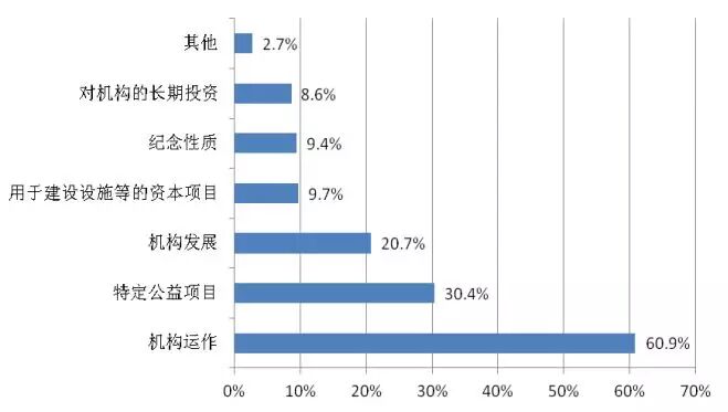 还有一个重要特征是越来越多的富裕人口乐意为非营利机构提供日常运行和能力建设的资金。图16展现的是美国高收入群体最高额赠款的使用目的,可以看到61%的富人将他们最大的一笔赠款用来支持受赠机构的日常运作,另有21%的富人将最高额赠款用来支持机构的长远发展,比如建立捐赠基金。对于公益机构来说,最难筹措到的就是那些能够用以维持和扩大运作成本的资金,因为捐赠人往往更希望资助能直接看到成果的具体的项目,但事实上任何机构都需要充足的运作资金来得以发展,这包括加强和执行项目、启动新创意的能力、雇佣和培训人才、扩大服务市场,更新设备、规避财务风险等需要。美国人能够看到这方面的需求,希望将来在中国做公益也能有这种立足长远的趋势。