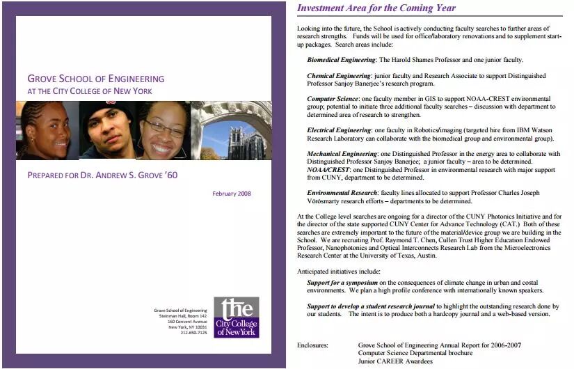 图12-14是体现问责性的例子。图12是美国联合国儿童基金会所制作的捐赠人认可手册的封面和目录,图13是美国纽约市立大学工程学院为一位捐赠人提供的年度报告封面及总结信,图14展示的是某一个捐赠基金的财务报告。