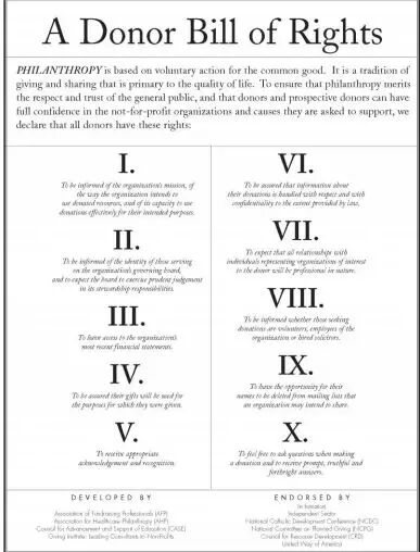最后来讨论从捐赠人的角度看,应该如何提升素养。捐赠人首先要明确自己的权益,捐赠人在考虑如何分配善款时,就仿佛投资者在决定怎样运用他的财富去投资。在做出选择之前,投资者需要了解每种投资产品的影响、风险、回报及其运行情况。同样捐赠人面对着形形色色的非营利机构及其公益项目,他们也有知情权,需要在了解和研究的基础上做出决定。图15是一份叫做捐赠人权利的文件,它是由美国多家行业组织于1993年共同完成的,被整个筹款业所接受,其中包括保护捐赠人的知情权、问责权、隐私权等等。