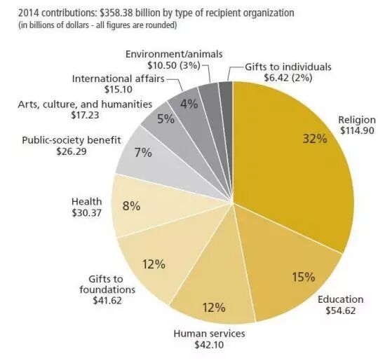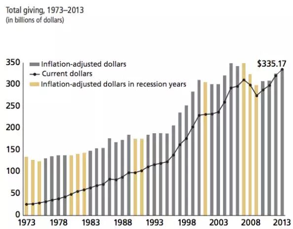 图7显示了美国自1973年有权威统计数据以来的捐赠趋势。2008年次贷危机之后,美国已全然走出了捐赠低谷,获得了历史的新高。美国人的公益精神源于传统的文化精神,是他们的核心价值观之一,从这些数据看,捐赠的韧性和恢复能力是非常强的。公益行为和金融市场一样是有周期性的,股票市场是捐赠的晴雨表。研究表明,当股指上升时,人们就更愿意慷慨解囊,这一点对于高收入群体特别明显,因为许多高收入者都持有一定的股票资产。研究还发现捐赠受经济好转的影响比经济萧条时更大,也就是说当经济走上正轨时能较快的带动捐赠的回升,这也解释了为什么2014年的捐赠反弹到历史的最高。