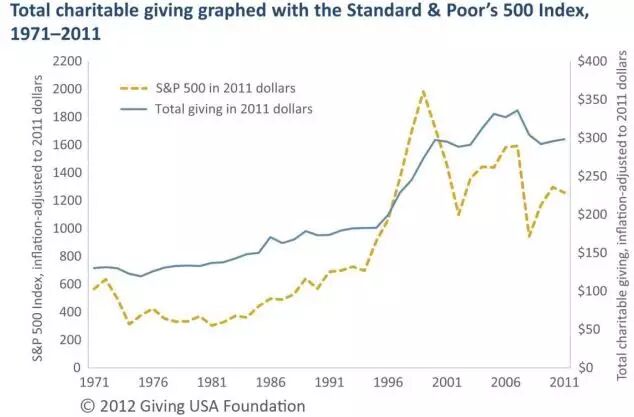 图8显示了捐赠和标准普尔500指数之间的密切关系,总体上看跟标指的动荡起伏相比,捐赠的曲线要平稳缓和的多,并且通常在股市动荡一到两年之后才作出明显反应。比如1999到2002年,尽管股市剧烈下跌,捐赠总额只是略有下滑,到2007到2008年标指爆跌40.7%时,捐赠总额仅下降了9.5%。